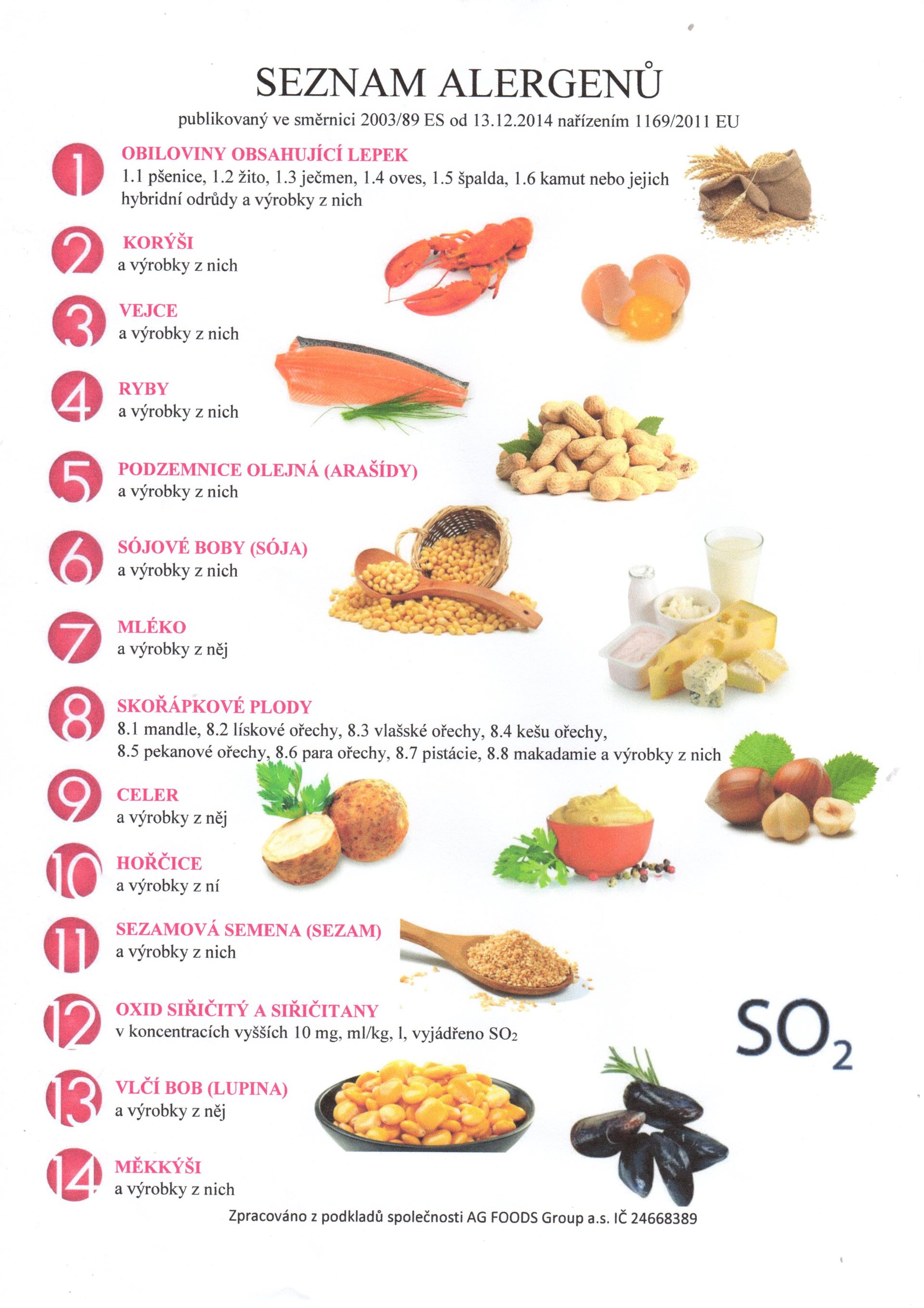 Seznam alergenů publikovaný ve směrnici 2003/89 ES od 13.12.2014 nařízením 1169/2011 EU najdete zde.
