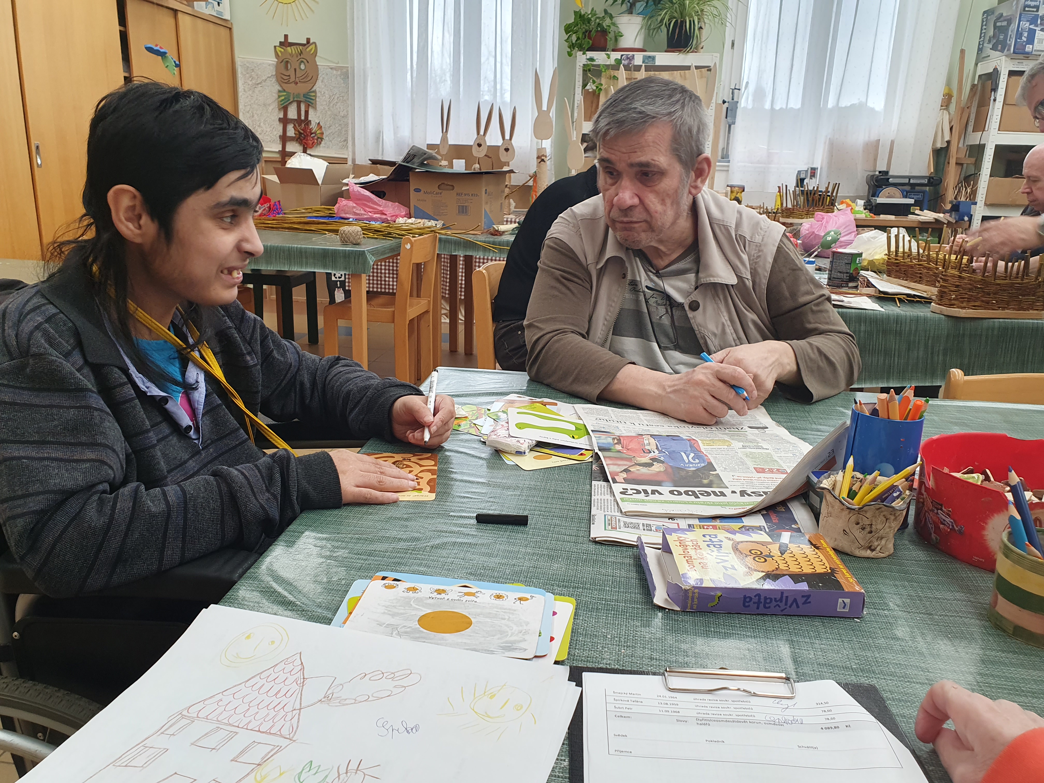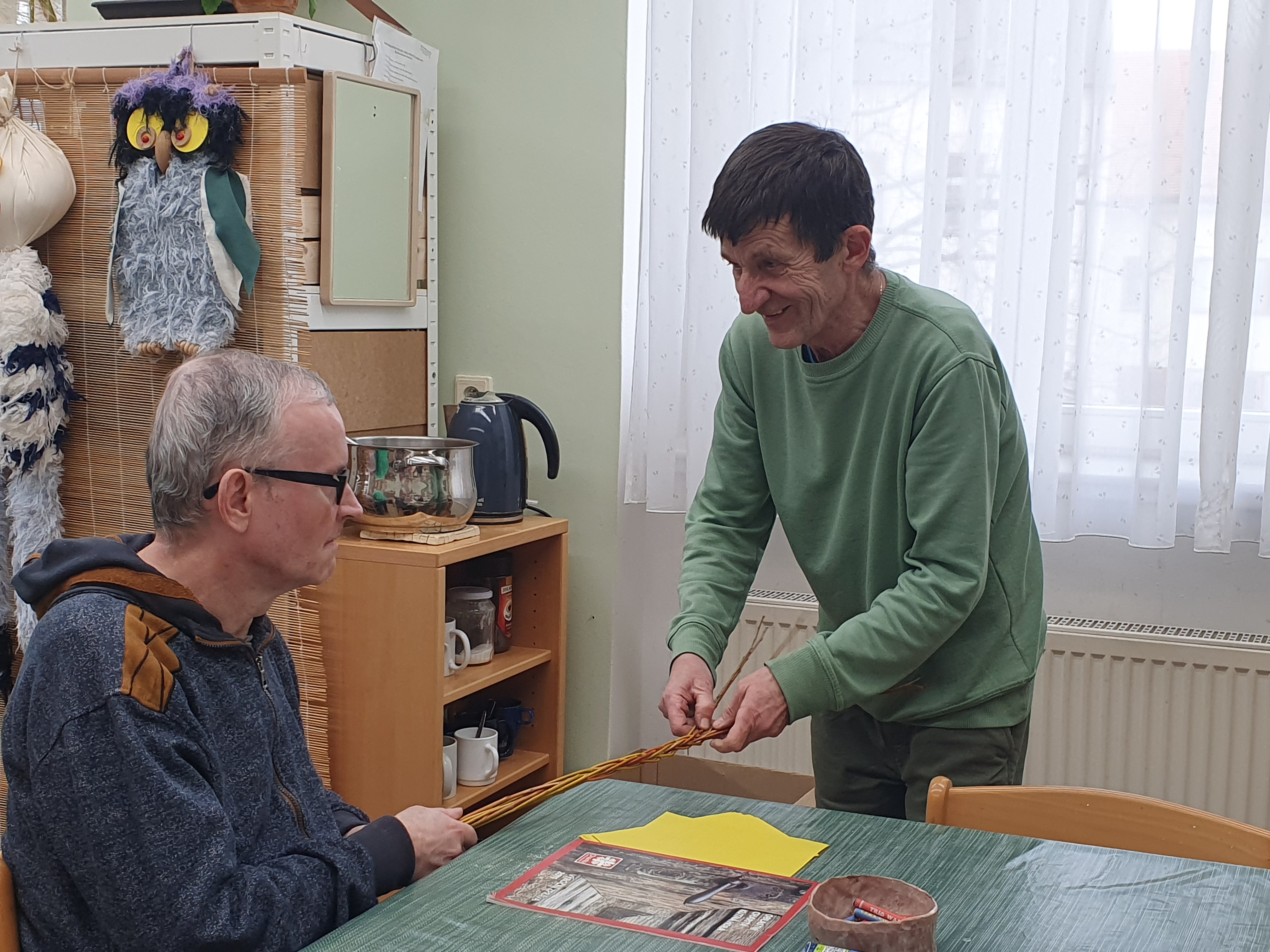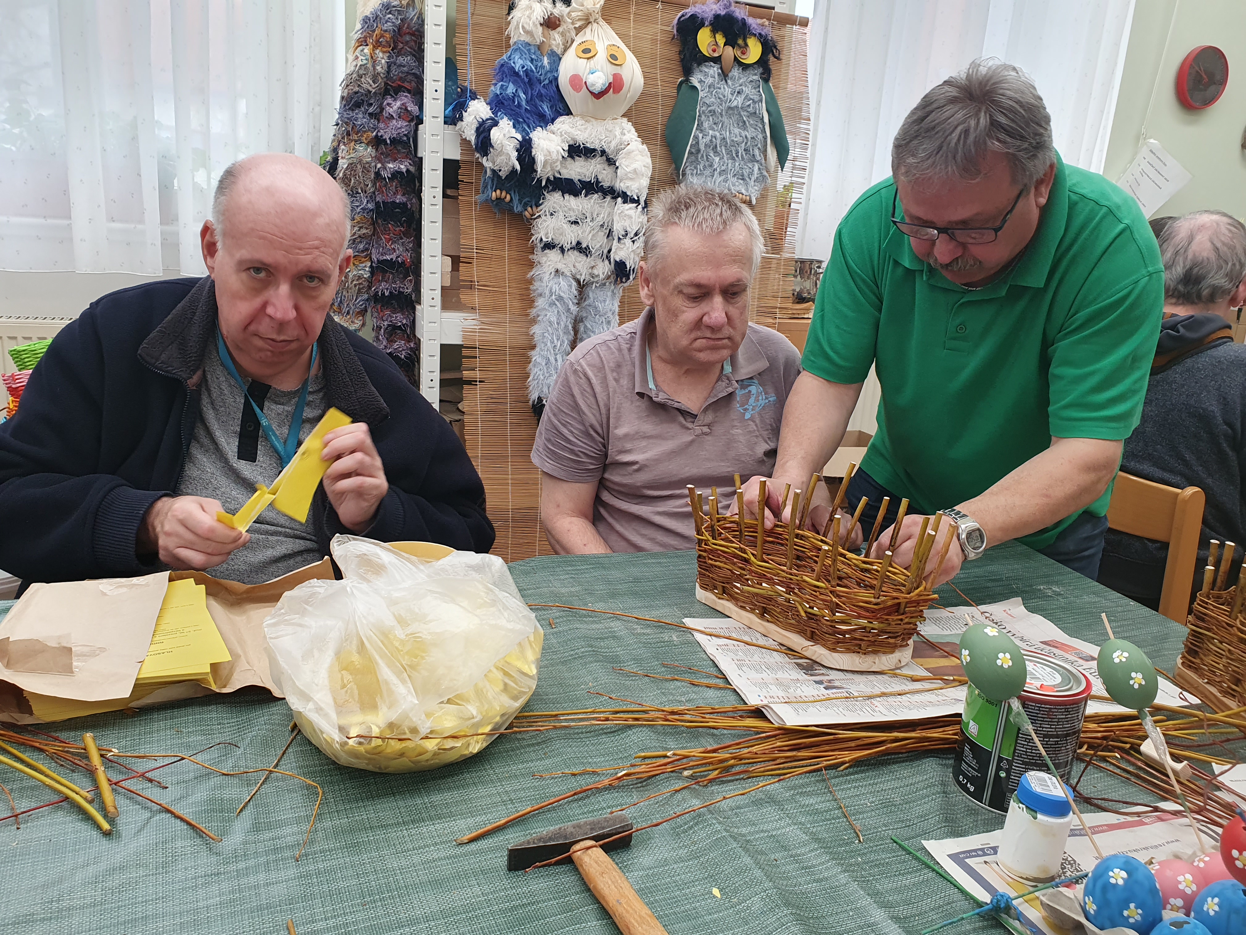 Pleteme velikonoční pomlázky i košíky. Připravujeme se tak na velikonoční výstavu, která se uskuteční pro klienty a jejich blízké a pracovníky v příštím týdnu.