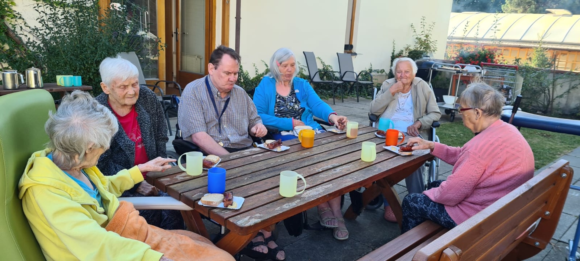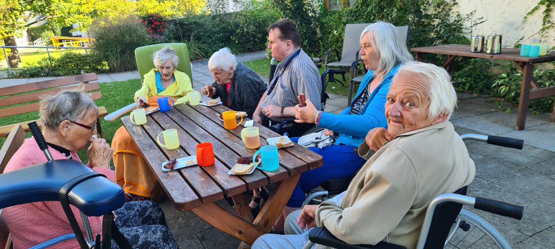 Opékání špekáčků na zahradě Domova ukončení grilovací sezony a letního období.