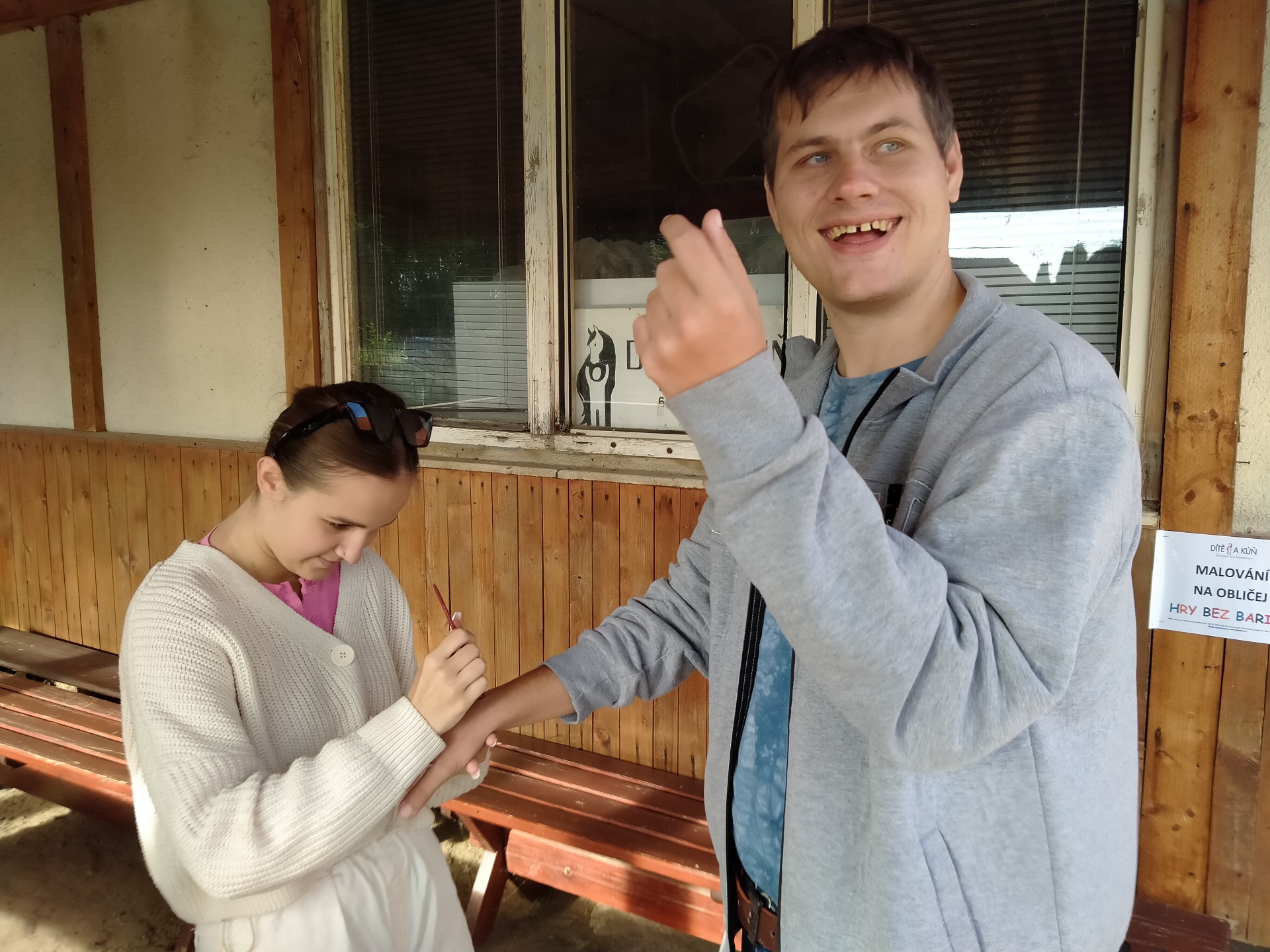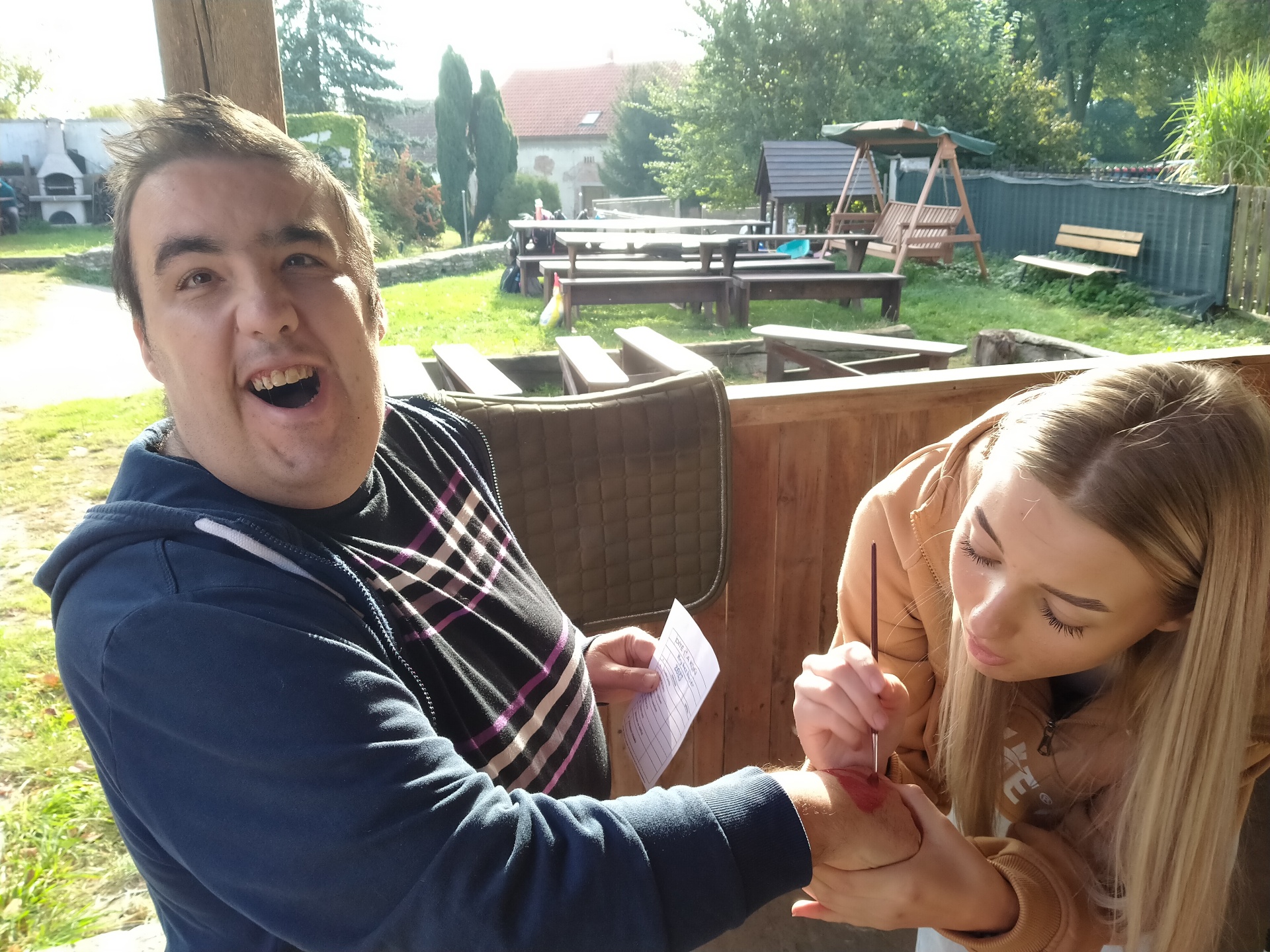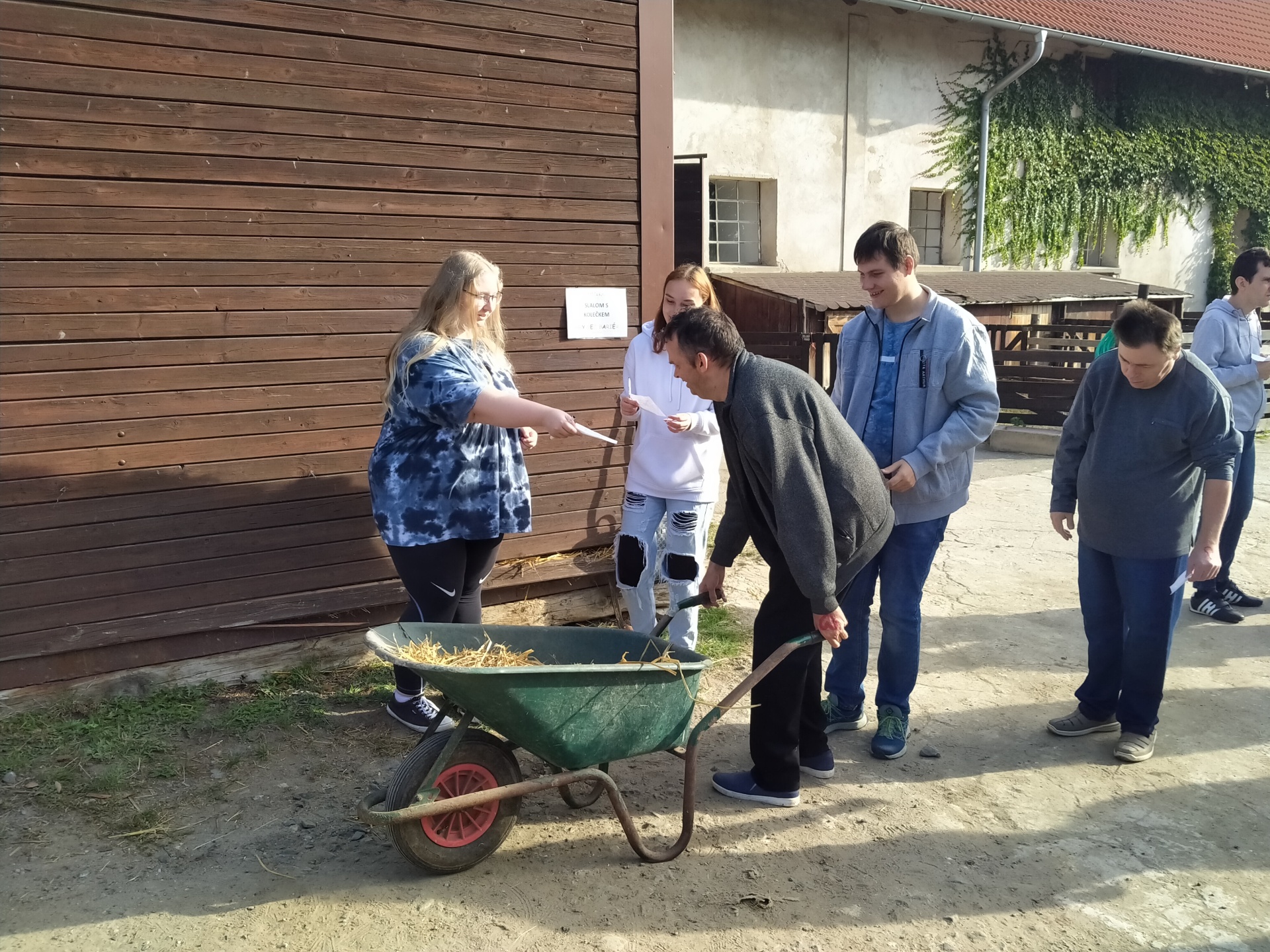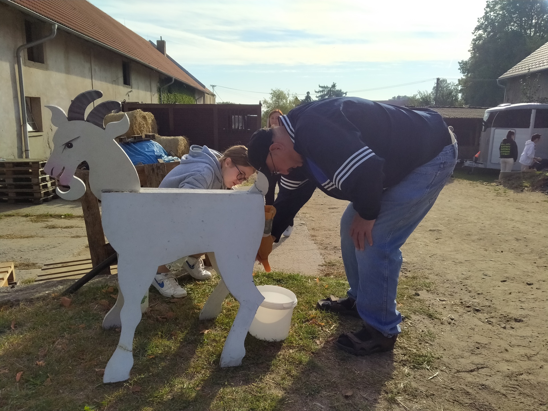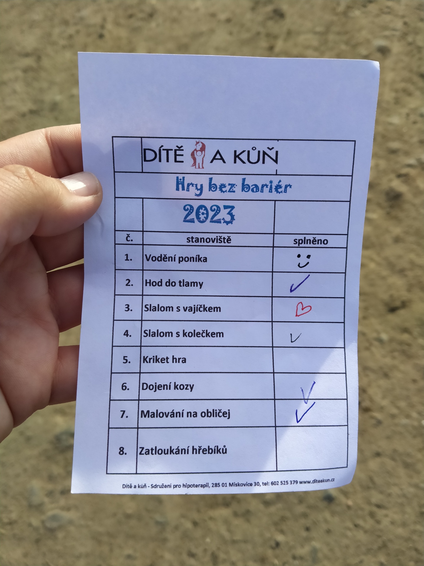 Vyzkoušeli jsme si podojit kozu, dali jsme si slalom s vajíčkem, slalom s kolečkem naložený hnojem, nechali jsem si namalovat na ruce srdíčka, zatloukali jsme hřebíky, hráli kriket a ještě jsem se prošli s koněm.