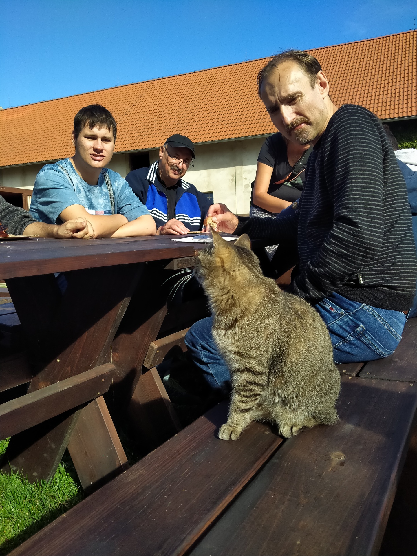 Mnohé z nás nejvíc bavila ještě společnost malé kočky, která se vůbec nebála a poseděla s námi u stolu. No, taky dostala kousek chleba a buřta.
